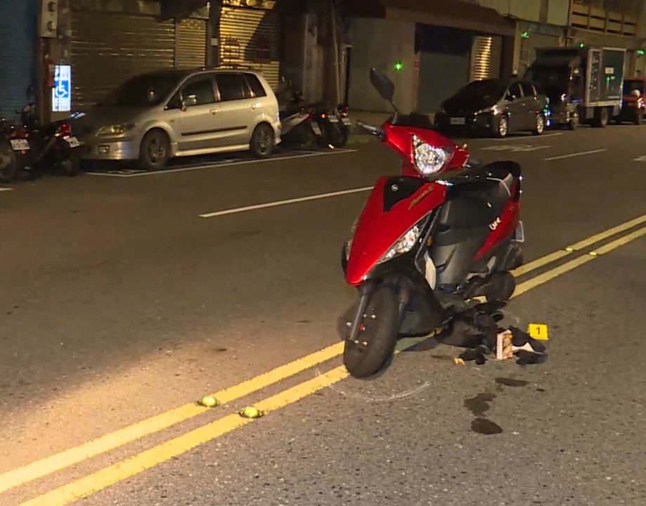 地上長長的血跡從馬路中流到旁邊車格,機車車殼、零件散落一地,安全帽也被撞飛,旁邊另一輛遭撞機車受損更嚴重,整個龍頭幾乎全毀。