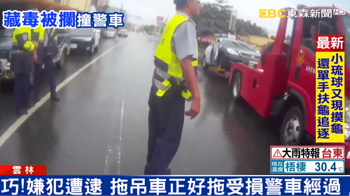 不過逮捕嫌犯過程,那一輛遭嫌犯衝撞的警車剛好經過,由拖吊車正要拖去送修。