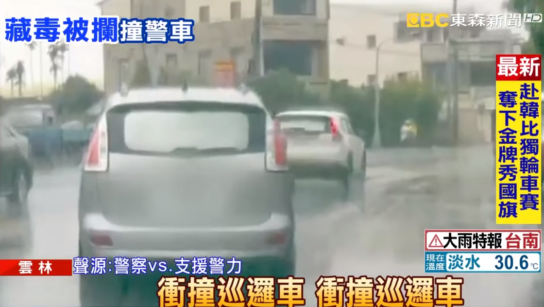 雲林警方以警車攔載毒蟲座車,結果毒蟲發狠衝撞警車,車門被撞到反折180度全毀,嫌犯逃了500公尺後,將車丟棄路邊,四處躲藏,但