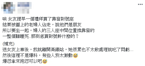 一名男網友19日在臉書社團「爆怨公社」發文:「女友提早一個禮拜買了靠窗對號座,結果被圖上的老婦人佔走…」,起初女友還以為老婦坐錯位子,詢問後老婦竟然回應「旁邊是我朋友,所以要坐一起」,讓女友聽完超傻眼,但因為太累、又怕事情沒完沒了,默默吃了悶虧,男友看不下去才發文抱怨。