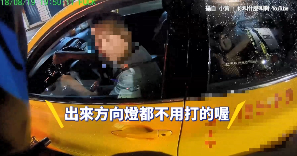 方向燈都不用打的喔?」小黃駕駛:「我剛剛切出來…」機車騎士:「方向燈有沒有打?怎樣,你有沒有看到後面的人?」小黃駕駛:「我看到。」機車騎士:「你知道後面快撞到嗎?喇叭按那麼大聲,快撞到不知道嗎?」小黃駕駛:「你叫什麼叫呀。」