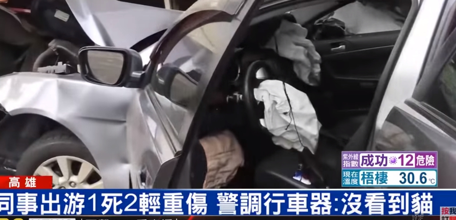 這起車禍發生在昨(19)日下午4點多,高雄鳳山區凱旋路段,肇事的楊姓駕駛從事廚師的工作,休假和同事一起出遊卻發生車禍,他自己頭部輕傷,但坐在副駕駛和後座的同事都沒有繫安全帶,王姓同事頭部重創送醫不治,後座的劉姓同事頸椎受傷還在治療,由於車禍路段車流量並不多,從現場撞擊痕跡研判,當時車速不慢加上又碰上下雨天,可能因此失控撞車。