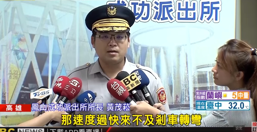 鳳山成功派出所所長黃茂菘:「他說為了閃貓轉彎不慎,但是因為拍的時候,旁邊是不是有貓跑出來我們不得而知,那速度過快來不及剎車轉彎這是一定有的。」