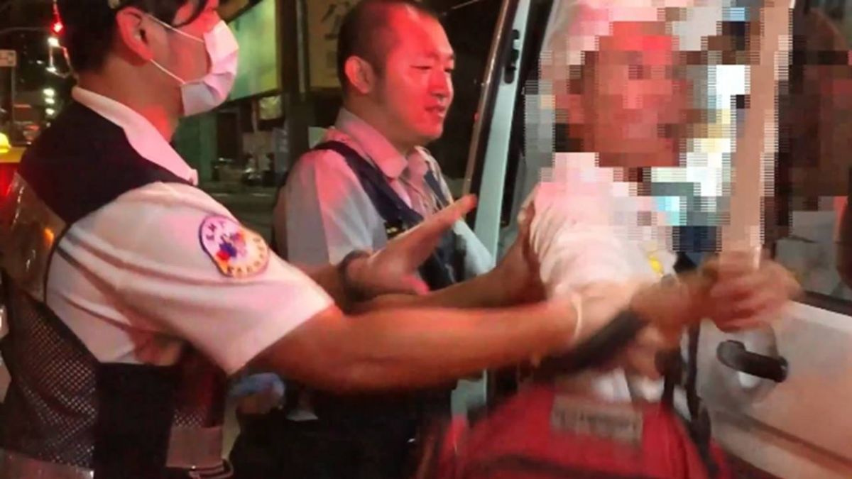 喝醉酒的白衣男子衣服和臉血跡斑斑不斷大聲吆喝,就怕再次發生肢體衝突,警方連忙架著他,等到救護車到場後,警消將他送上救護車查看傷勢,但他疑似看到鏡頭正在拍攝,大聲嗆聲。