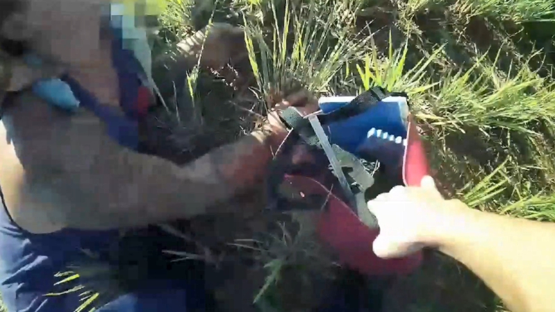 男子熱到連反抗的力氣都沒了,只得乖乖坐在地上配合員警搜查。