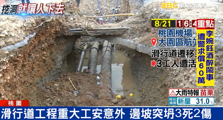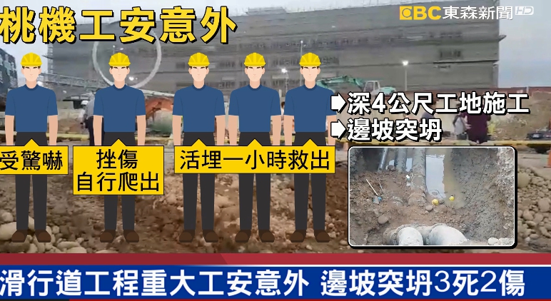 警消獲報到場,現場圍起封鎖線進一步調查釐清,昨(21日)下午4點多,桃機場大園區航站,正在進行滑行道遷移工程,沒想到3名工人慘遭活埋身亡,當時原本5名工人站在深4公尺的工地內施工,邊坡卻突坍塌,其中1人受驚嚇、1人挫傷自行爬出來,另外3名工人被活埋1小時後救出,已經沒了生命跡象,送醫搶救宣告不治,勞動部也介入追查。