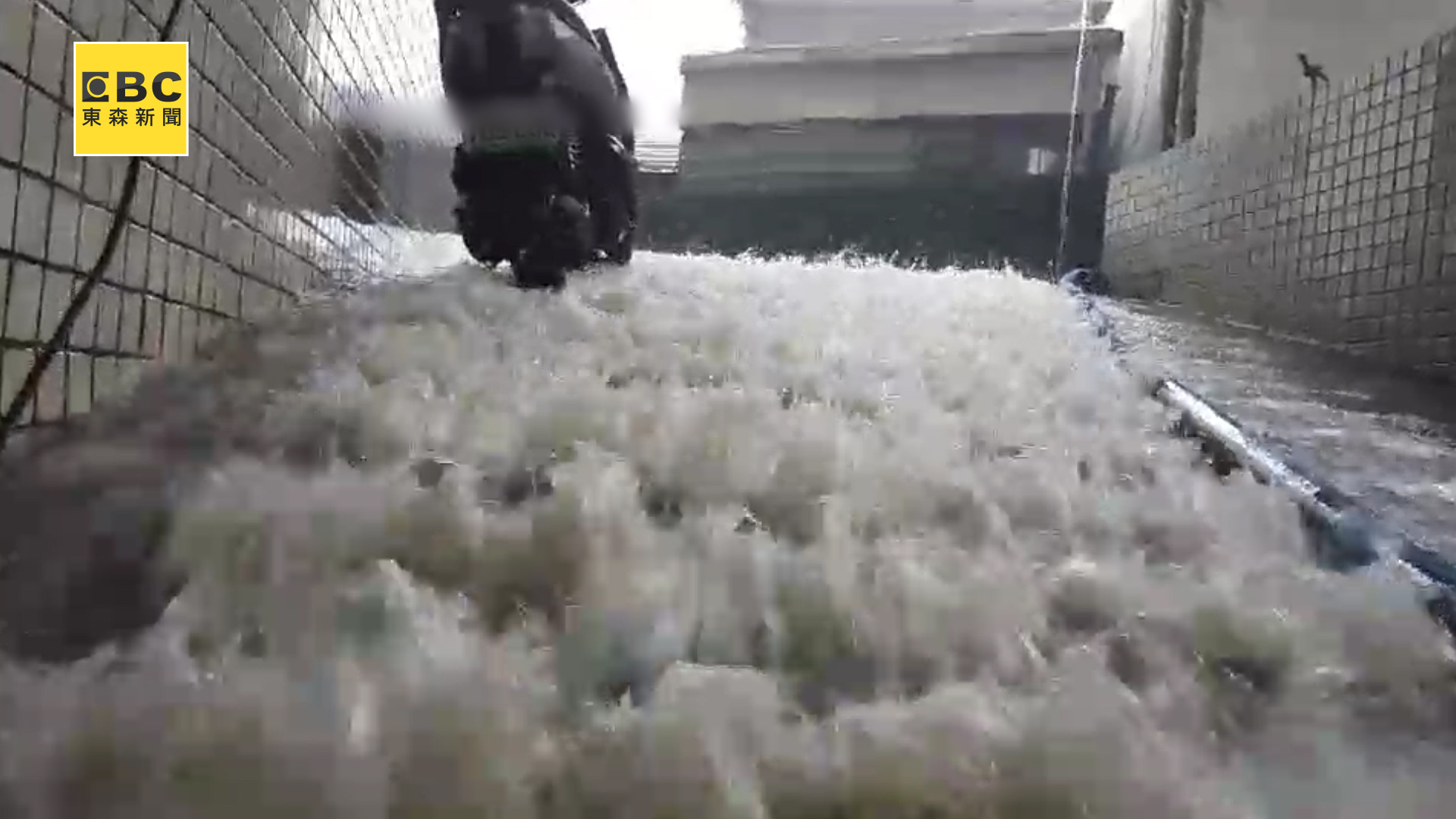 台南水患成災,位於大同路二段的一棟大樓,水直接灌進地下室,停車場儼然成了一座「小瀑布」,電箱開關全部都進水!
