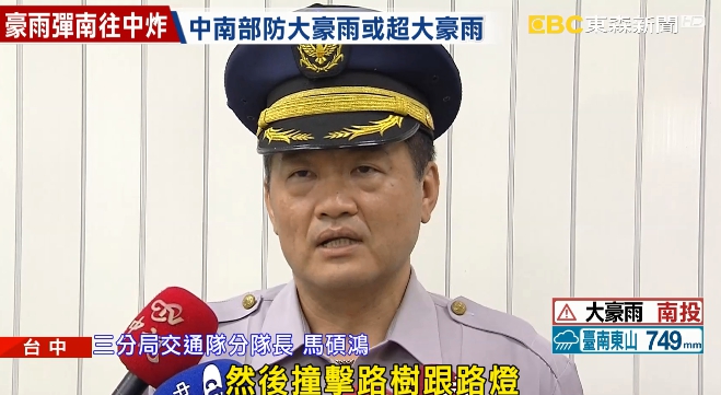 三分局交通隊分隊長 馬碩鴻:自稱要閃避前方車,而往左邊打滑,然後撞擊路樹跟路燈,造成路燈倒地。