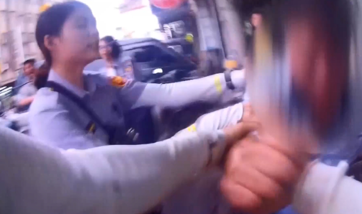 警方:「沒關係,你停,ㄟ~搞什麼東西啊。」男子醉醺醺滿臉通紅全身酒氣,這往前一揮,差點就打道這名警校女實習生,不過像是抓狂似的不斷對著警察揮拳。