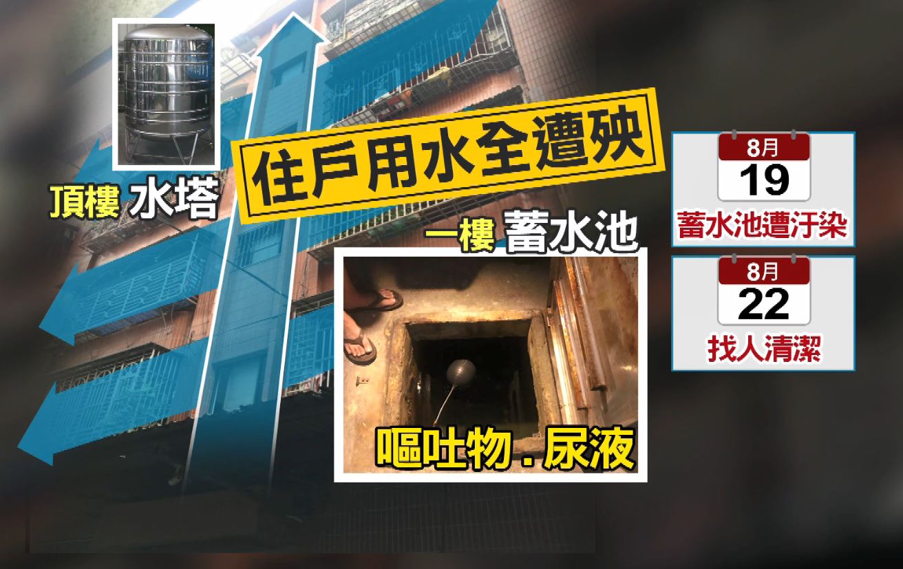 住戶拍下監視器畫面,張貼在公寓門口提醒附近鄰居,因為萬一下次他進來不是嘔吐,而是扔了什麼有害物質到水裡,那可不得了。公寓是雙拼形式,只要水塔沒水,就會從蓄水池抽上來供應住戶使用,等於是所有住戶日常用水的來源,男子當晚隨意小便加嘔吐,讓整棟公寓用水全部遭殃。19日蓄水池遭汙染,22日才找到人清理,這整整3天當中,完全沒人敢用水。公寓住戶:「那些水我都不敢喝,趕快去跟對面的要水,都不知道吐了幾次,應該是喝酒喝醉了,就吐在那邊。」