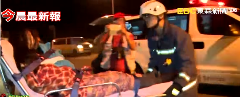 救護人員一到場立即展開搶救,可以看到躺在擔架上的傷患,疑似是雙腿有骨折的現像,神情相當痛苦,救護人員連忙將他處理傷口送上救護車。
