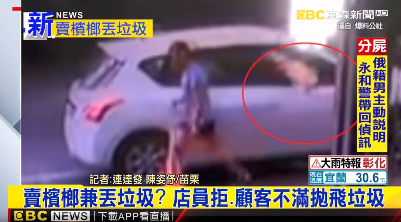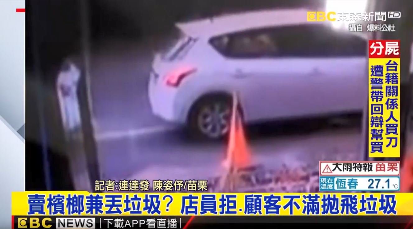 一台白色車輛停在檳榔攤前要買檳榔,畫面中可以看到店員拿檳榔走到右車門,把檳榔遞給客人,女子收了錢後轉身離開,這時車內卻飛出一袋東西,仔細一看,竟然是一包大垃圾!