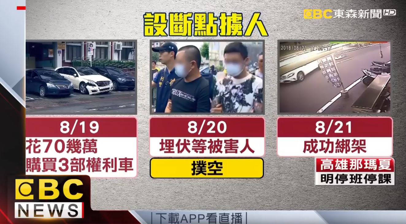 為了綁架,嫌犯先用假身分花70幾萬元,在高雄前鎮區購買了3部權利車,交車後又把車藏在裕誠路上的私人停車場,處處設立斷點,仍然不敵警方調閱上千支監視器,身分一一被揪出。仁武偵查隊隊長徐文鴻:「(靠著)上千部的攝影機,終於追查到這3部權利車的下落,發現在雲林的許姓及林姓(嫌犯)涉有重嫌。」