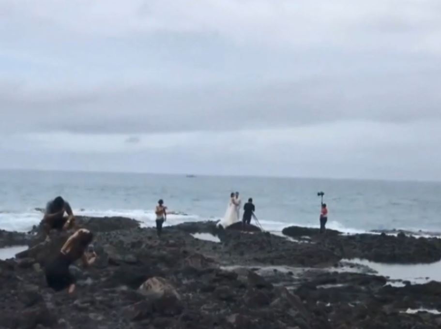 海岸邊,一對新人正在拍攝婚紗,突然間,一陣大浪襲來,把兩人捲進海裡。就怕兩人發生危險,一旁的助理立刻跳進海中救人,畫面千鈞一髮。所幸兩人是掉在礁岩洞的水池裡,沒被海浪捲走,只是兩人全成落湯雞,婚紗當然拍不成,只好收拾行囊打道回府。