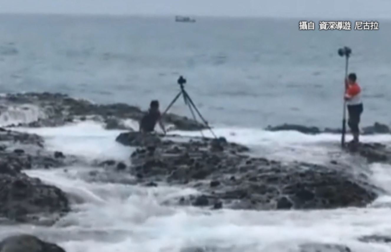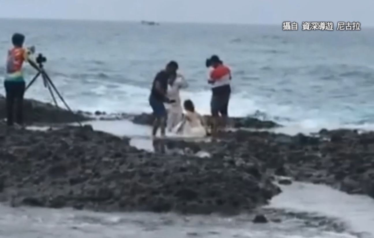 真的太危險了!一名導遊23日下午前往花蓮豐濱鄉,看到有新人站在海邊拍攝婚紗,他認為非常危險,拿手機拍攝畫面,沒想到正好拍到一陣大浪打過來,2人掉進礁岩洞的水池,一旁的攝影助理立刻跳進海裡把人拉上來,場面相當驚險。
