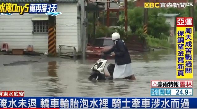 轎車高速經過,激起的超高水花,狠狠拍在騎士身上,連日暴雨,讓台一線淹水變成小河流,當地老經驗的駕駛都知道,屏東水底寮逢雨必淹,如果車子不快速通過,引擎很可能會積水,拋錨在路中。