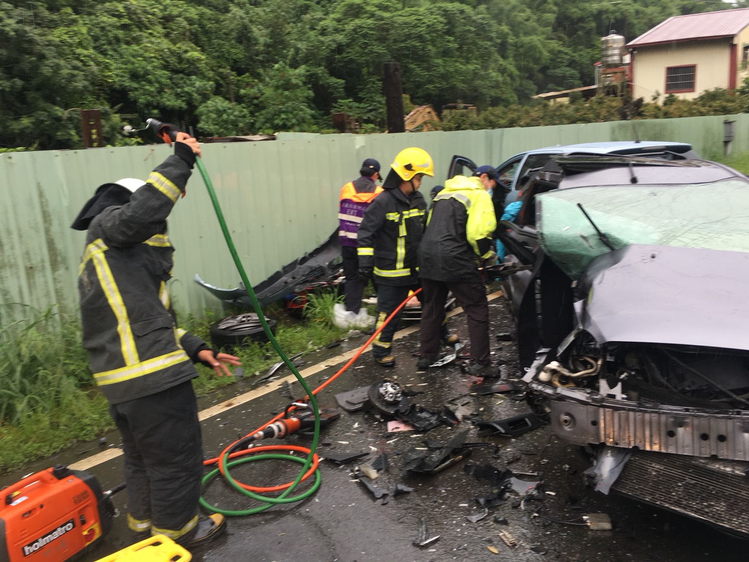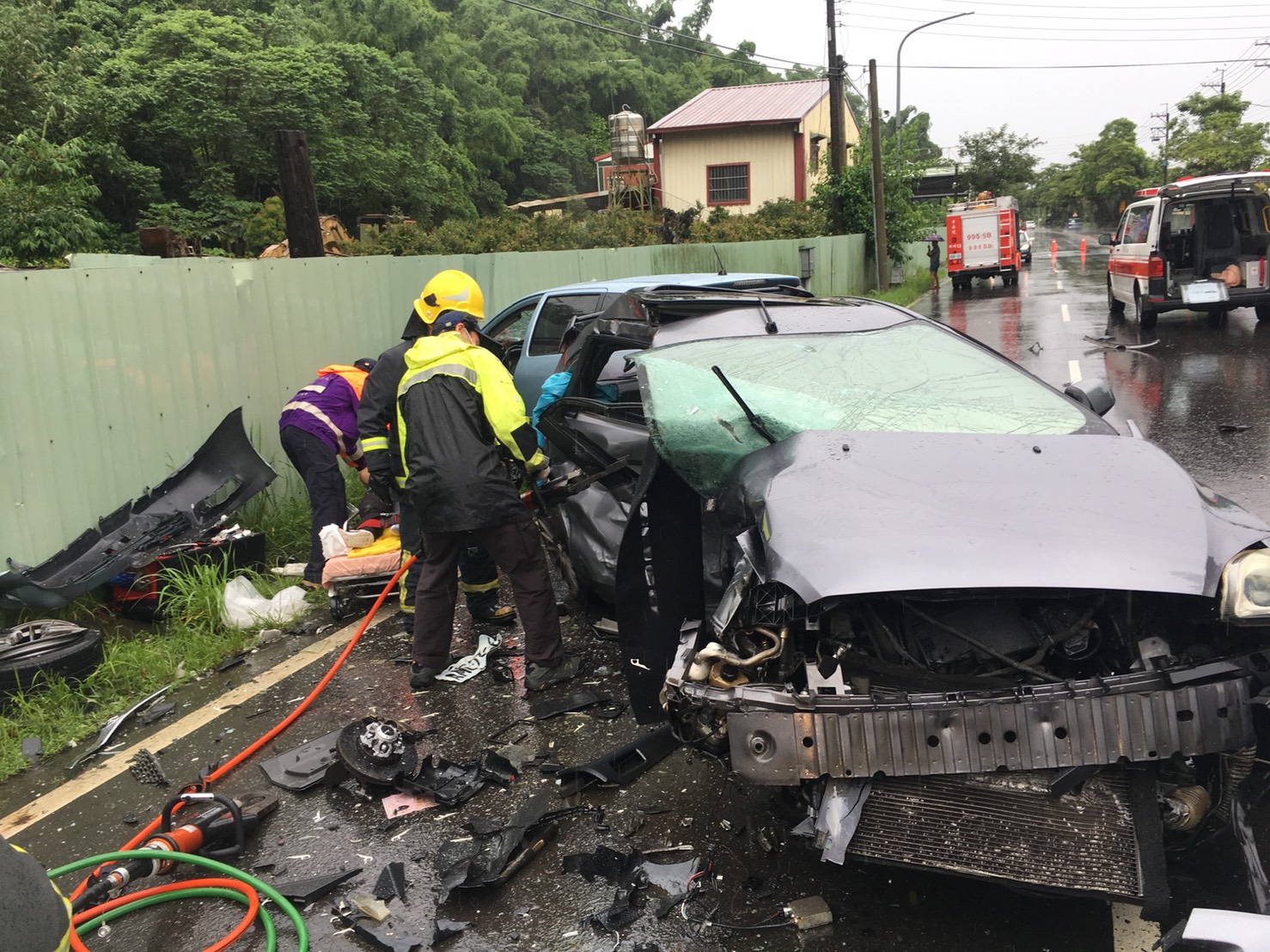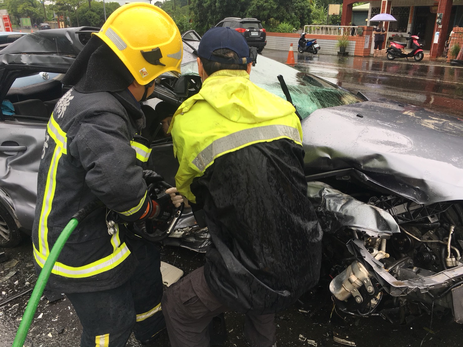 相撞車禍,由於撞擊力道過大,身灰色自小客車嚴重變形,車內男性駕駛受困車內,消防隊員透過破壞器材協助脫困,呈現無呼吸心跳狀態,另一台女駕駛則意識清楚,已將2人送醫急救。