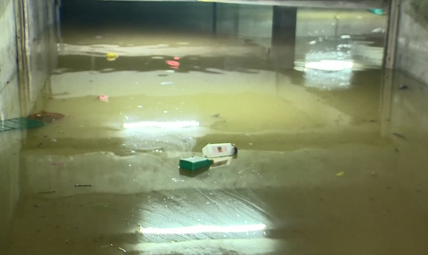 店家清出一包一包的垃圾,這些原本可以賺錢的用品,現在全部隨水流。馬路上的水淹到差不多7、80公分,民宅的部分也受到影響,地上的水黃澄澄的,雨水整個直接溢到地下室裡頭。樂器行的老闆也十分無奈,因為地下練團室的音響設備都是最好的,現在被大水一淹,可能全都報銷。樂器行業者:「我擺在地上,整個就進來,本來以為有滯洪池應該是OK,可是好像還是沒用。」