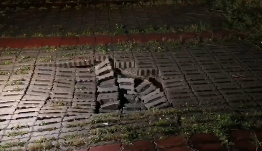 天色昏暗,但這石磚怎麼凹了一大半,仔細一看,不遠處也有這樣的情況,警方接獲通報,就怕會出意外,趕到現場拉起層層封鎖線。