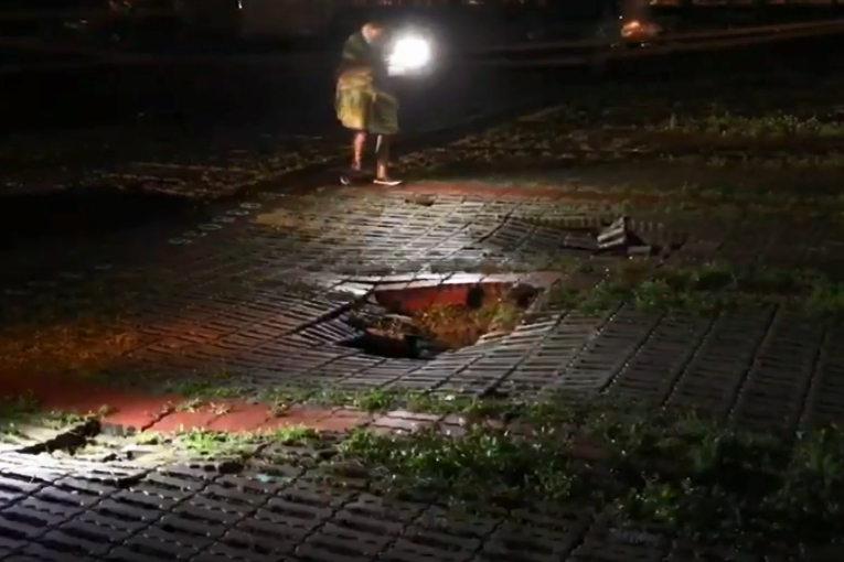 事情就發生在28號晚上7點多,高雄前鎮區一處停車場,疑似下了好幾天的暴雨,造成地基掏空塌陷,警方到場查看,發現下陷範圍深度竟然有150公分,立刻封鎖現場。