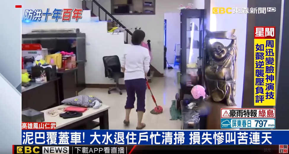 除了鳳山外,仁武地區積水也相當嚴重,水淹住宅1樓,民眾家裡的物品都被大水沖到馬路上,如今雨勢漸緩,水位退去,卻帶不走灌進的泥土跟垃圾,居民除了心痛傢俱泡湯外,清理也成為一大問題。