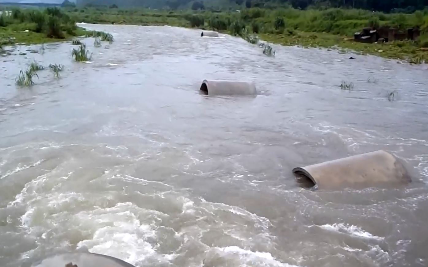 南投埔里的愛村橋去年6月被沖毀,埔里鎮公所斥資800萬,興建函館便道,以10根水泥涵管連結,方便附近居民通行,但今年7月的大雨已經沖走了7根,這次又下連日大雨,剩下的3根涵管沖得一根不剩,居民出入受阻。附近居民:「想來爭取鋼