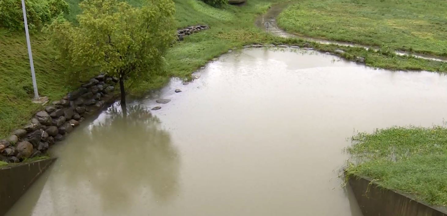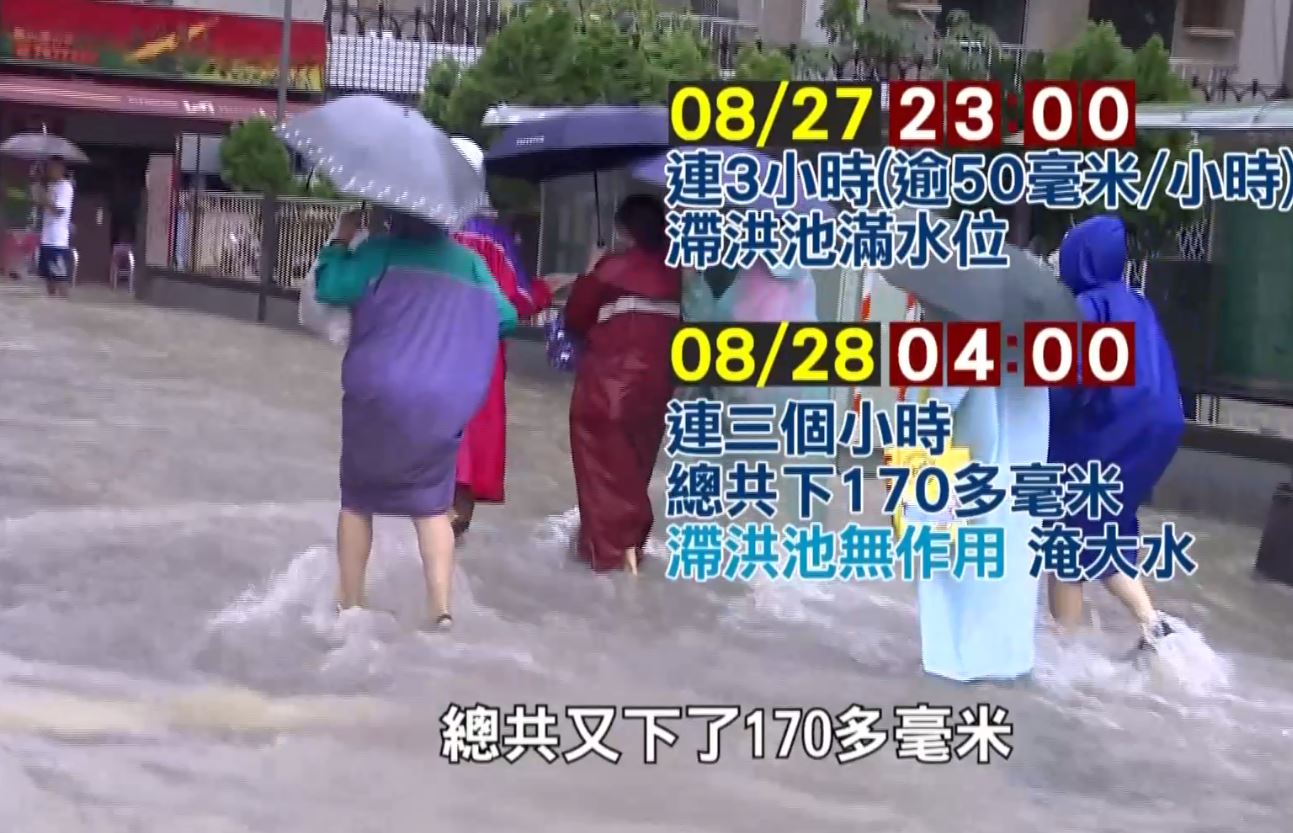 滯洪池,難道滯洪池沒有發揮作用?原來這個滯洪池最大裝水極限是10萬噸,水利局說,這個滯洪池是以5年降雨頻率做為保護標準,也就是如果以一個小時下50幾毫米,可以撐3個小時。但這回因為有連續兩波強降雨,來不及宣洩,但也因為有滯洪池蓄下第一波雨水,否則恐怕水會淹好幾米深。