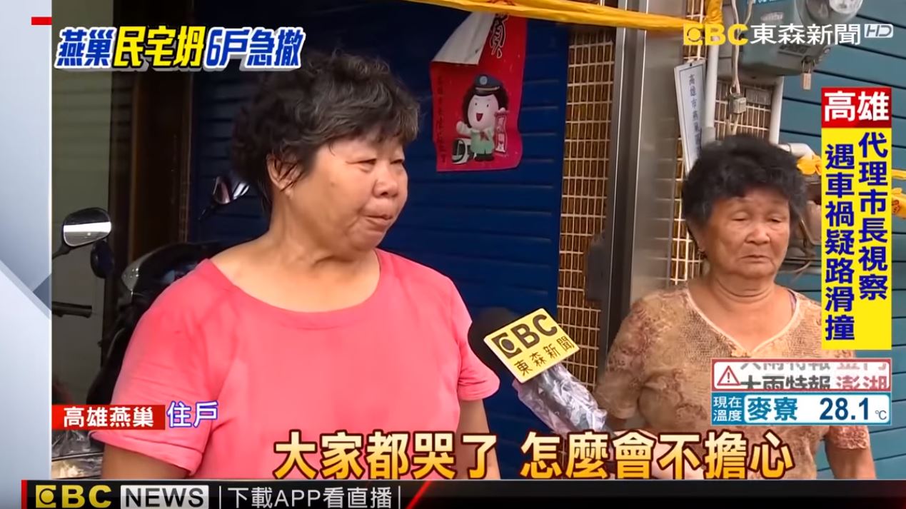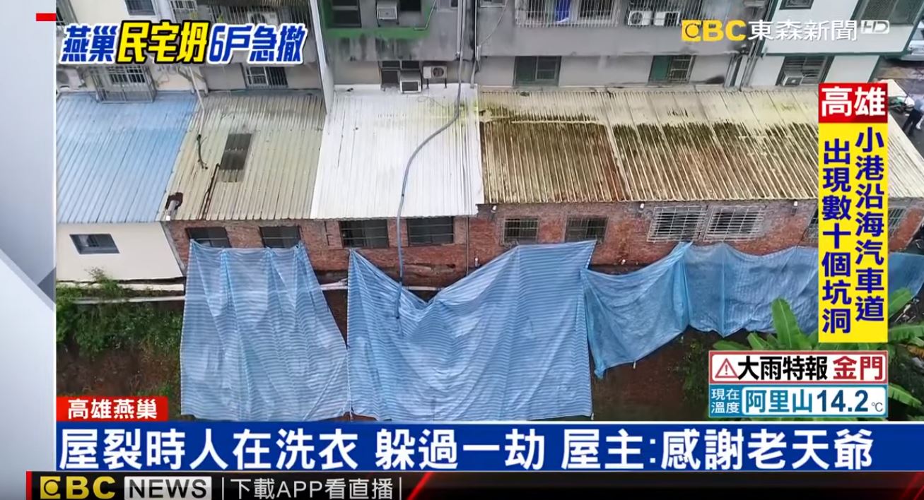透過空拍畫面,可以看到一樓7戶相連的民宅外牆裂了好大一個縫,住戶只好先用帆布蓋住外牆,17名住戶緊急撤離,只能利用雨勢暫緩的時候回來收拾家當。住戶:「大家都哭了,怎麼會不擔心?煩惱屋子又繼續崩落,都不知道該怎麼處理了,怎麼會不擔心。」