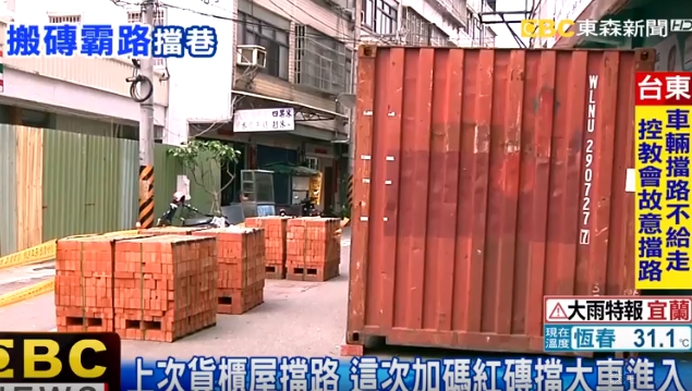 地主,先前就因為既成道路問題,和當地住戶爭執,自稱土地所有權的地主,上次載一個貨櫃屋和磚塊來
