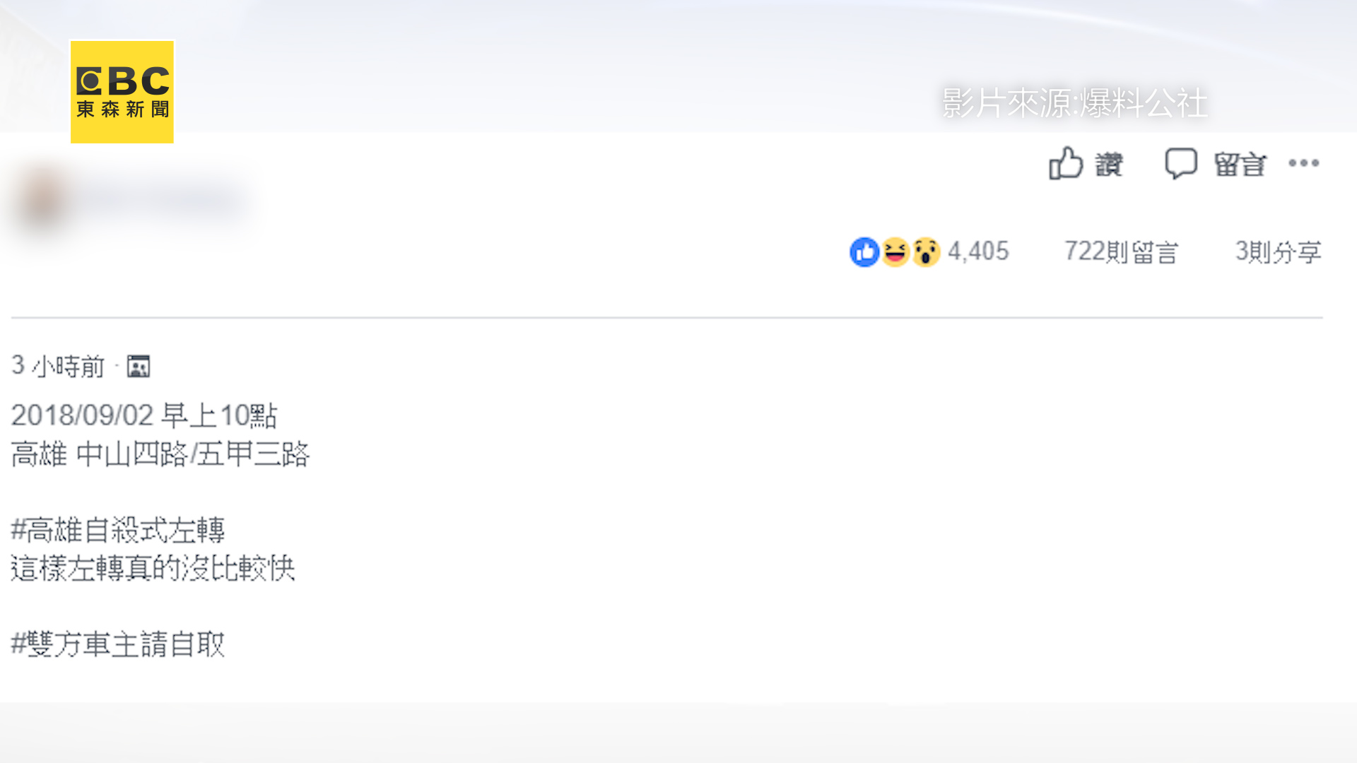 高雄一名駕駛行經中山四路口時,看見右方突然竄出雙在騎士,由於騎士「逆二段式待轉」,遭左車道休旅車撞到,行車紀錄器被PO到爆料公社,網友直呼:「好療癒!我可以重看好幾遍!」