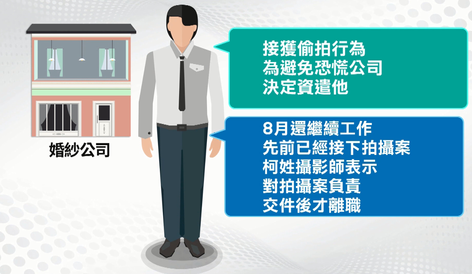 對此東森新聞記者實際向婚紗公司求證,公司坦承的確有聽說攝影師涉嫌偷拍,為了避免恐慌已經先把他資遣,至於8月還讓他繼續工作、出外景,是因為先前已經接下拍攝案件,柯姓攝影師表示對拍攝負責,所以交件後才正式離職,目前攝影師沒有回應,他因為作品獨特,受到公司重用拍攝宣傳照,卻涉入偷拍案,不只沒了工作,生活和聲譽也大受影響。