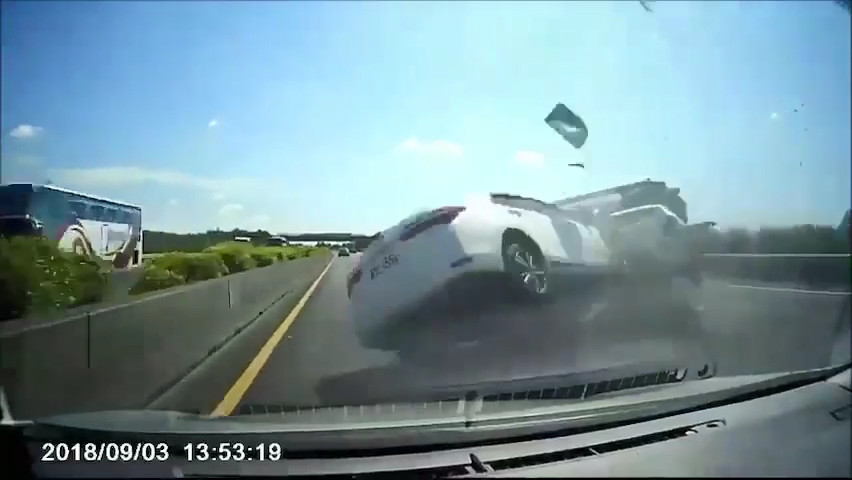 由民眾在網路上轉傳的行車記錄器畫面發現,一輛自小客車在國道上撞擊前方另一輛自小客車,導致兩輛車翻滾數圈。其中一輛車內的小朋友還被甩出車外,掉車道上,過程令人嚇出一身冷汗。