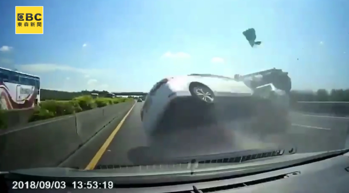 宛如飛車動作片電影般,日前一台白色轎車準備切換內側車道,未料失控撞上前方銀色汽車,瞬間兩車