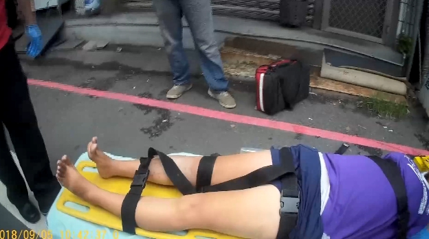 嘉義市的義教街上看到,聯結車經過這處彎道的十字路口時和一邊的機車騎士發生擦撞,女騎士當場人車倒地,就倒在聯結車邊,還好聯結車也連忙煞住。目擊店家:「聽到砰一聲她就倒在那裡了,一看她就倒在那裡了,我們平常也沒在看道路,只顧看鍋子怎麼砰一聲,人就倒在那裡了。」119人員趕到現場,女騎士倒在地上不能動,但是意識相當清楚,還可以和救護人員對話。