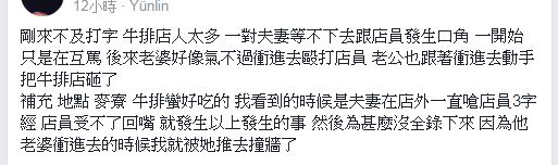 一名網友在臉書社團「爆料公社」貼出影片,表示他在雲林麥寮一間牛排店用餐,但一對夫妻等不了排隊人潮,便開始在店外大罵店員,店員受不了回嘴,未料夫妻倆整個抓狂,便和店家大吵了起來,之後老婆還衝進店裡找店員理論,老公也衝了進去,要把牛排店砸了。