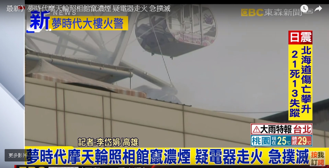 夢時代購物中心表示,疑似摩天輪紀念照拍攝機房電線走火,受損鐵皮屋約10坪大,經現場整理不影響營運遊樂區正常營業。
