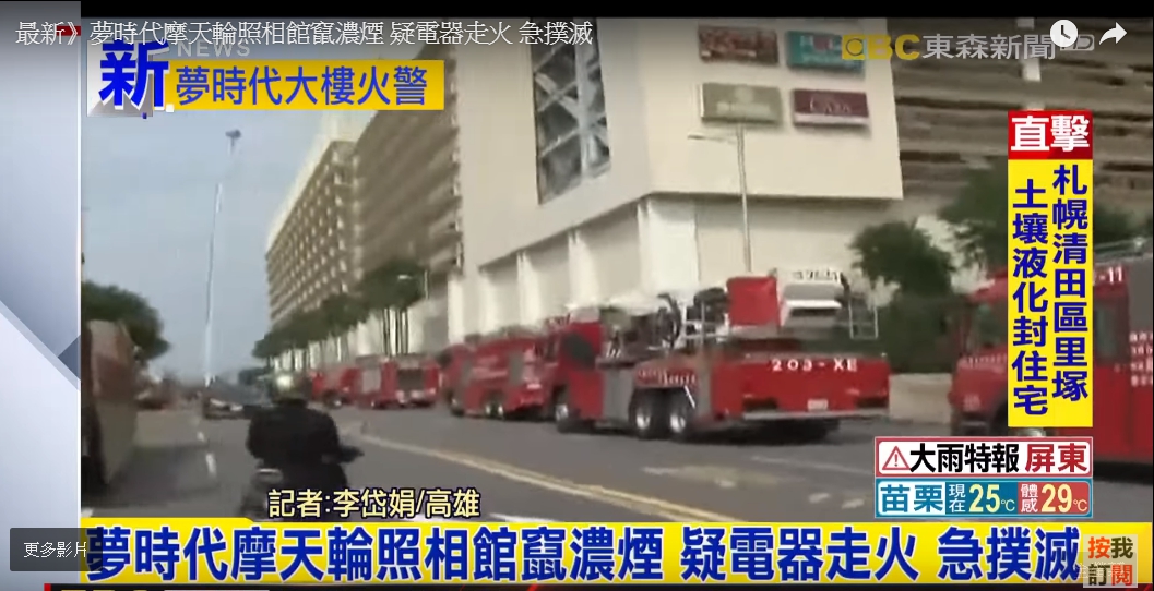 夢時代購物中心假日人潮湧現,是親子休憩的去處,但今天早上8時47分購物中心頂樓冒煙起火,一時濃煙密佈,從外部可以清楚看到像是摩天輪起火,警消出動12車次30人前往救火,在9時14分將殘火處理完成。