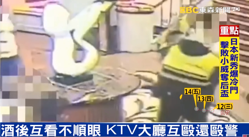 KTV,兩派人馬唱完歌喝了酒互看不順眼,當場在大廳內大打出手,警方獲報呼叫快打部隊趕來,把雙方人馬架開,不料其中一名酒客毆警又罵三字經,警方現場噴辣椒水制伏,將5名鬧事群眾帶回偵辦。