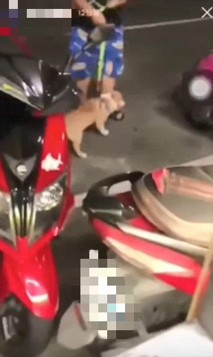 黑狗原本安穩地躺在自家門口,看到對街的2名陌生男子便朝他們吠了2聲,沒想到其中一名較年長男子心生不滿,竟叫小弟拿拖把毆打狗,只見男子拿拖把使勁地朝黑狗揮,黑狗被嚇得趕緊躲到機車後面,但男子仍不肯放過,不停換角度下毒手,惡劣行徑全被監視器拍下。