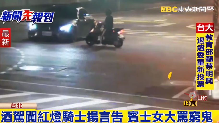 畫面上一輛賓士車緩緩開到路口前,這時號誌從綠燈變成紅燈,不過這賓士車並沒有停下打算,結果差點碰上綠燈通行的機車,事件發生在11號深夜,北市市民大道與東星街口,沒想到第一時間賓士車女駕駛不但酒駕,還恐嚇機車騎士,最後大罵他窮鬼揚長而去,讓這騎士氣得要死PO文要大家評理。