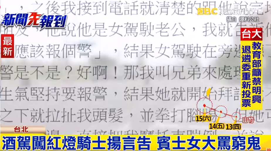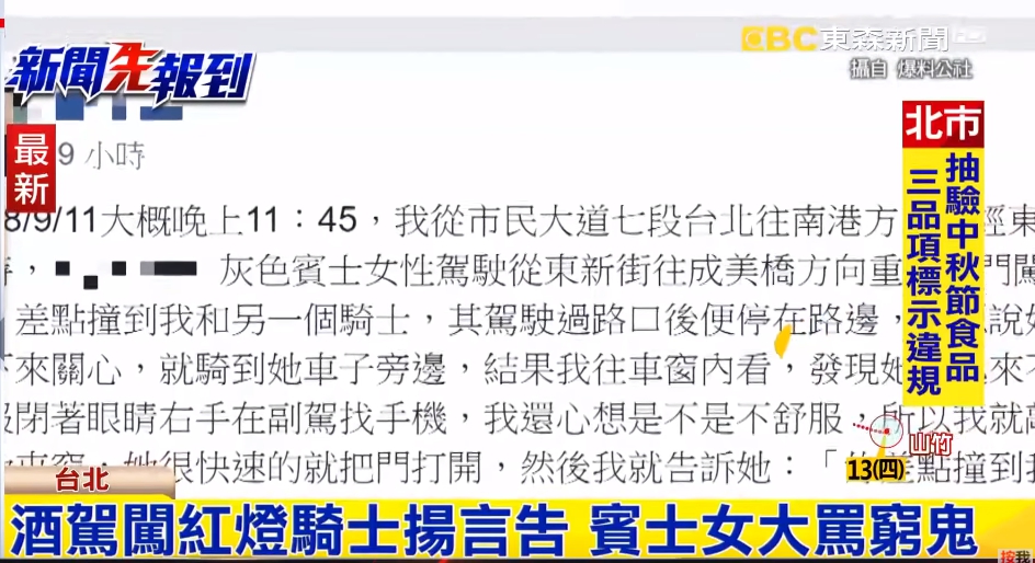騎士把文章PO上網後,網友一面倒支持騎士提告,酸這女子開賓士有什麼了不起,就可以酒駕,還有網友批評她,酒駕理虧還要撂兄弟太囂張,目前警方已對自小客車駕駛闖紅燈及相關的刑事責任,依法究辦。