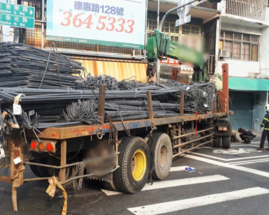 滿載建築鐵材的大貨車卡在人行道上,車頭頂著民宅大門,地上還留有血跡,事故發生在12號下午3點多,從路口監視器畫面可以看到,陳姓駕駛開車行經高雄一處路口,不料1輛機車闖紅燈,突然衝出來,大貨車往左邊閃避不及,就這麼撞了上去,場面驚險,一旁路人目睹過程,嚇得轉身摀住耳朵。