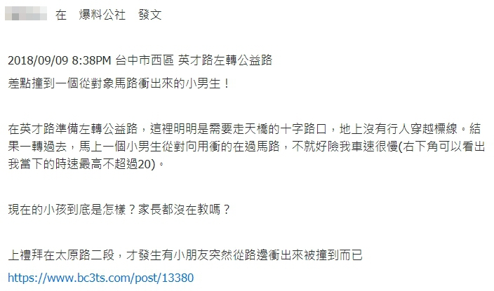《爆料公社》貼出行車紀錄器,表示9日晚上8點半左右開車行駛在台中市英才路,當他正要左轉到公益路時,一名身穿藍色上衣、黑色短褲的男童突然狂奔穿越馬路,好險當時車速很慢,他見狀馬上煞車才沒有撞到男童,原PO解釋,「這裡明明是需要走天橋的十字路口,地上沒有行人穿越標線!」遇到如此危險的行逕,讓原PO不禁想起日前在太原路二段,才發生有位小男童直接衝出車道,