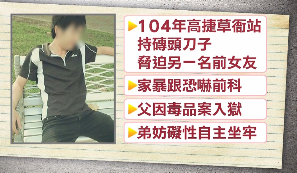 楊姓男子擔任服務生,個性衝,不是第一次對前女友有激烈舉動,104年在高捷草衙站就曾拿磚頭跟刀子脅迫另外一名前女友,也有家暴跟恐嚇前科,只要女方提出分手,他就會變成恐怖情人,家中父親因為毒品案入監服刑,弟弟因為妨礙性自主也在坐牢,這回他又帶走前女友回家,還好女方平安無事,現在曾姓女子待在家,由家人陪伴,希望男子能好聚好散,不要再打擾曾姓女子。