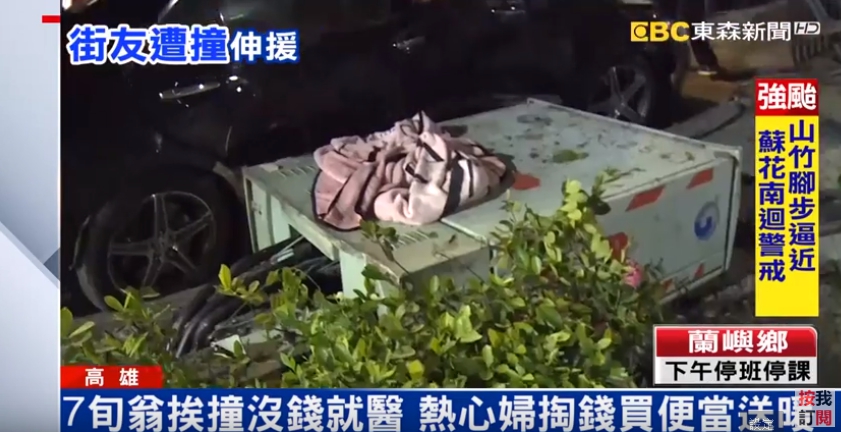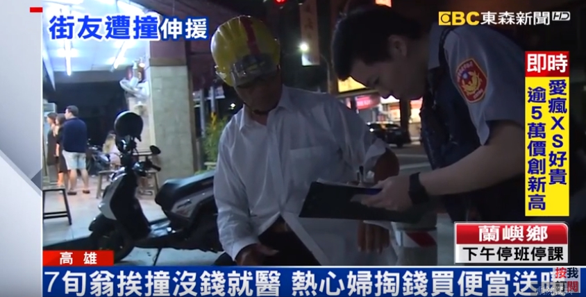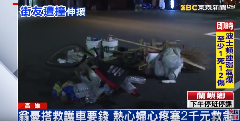 熱心民眾:「你搭救護車去好了啦~救護車載是不用錢的。」被波及的是一名75歲陳姓老翁,平常靠著撿拾資源回收維生,受傷了擔心搭救護車要錢,不敢就醫,住在附近的一位好心婦人,人美心也美,立刻吩咐家人拿2千元給他,甚至幫他叫救護車。