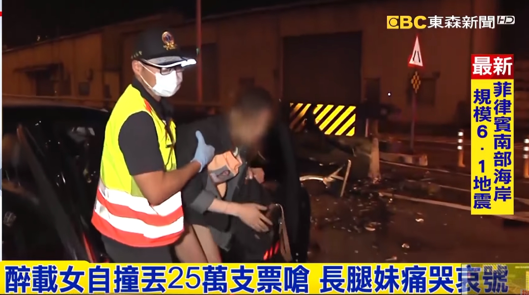 台中一輛百萬名車自撞匝道入口,駕駛酒測0.78,車上副駕是一名長腿辣妹,她痛得不斷哀號,任性地走上救護車不想理會駕駛男子,駕駛是36歲的林姓男子,自稱台商,對警察從頭到尾採取不合作態度,甚至大嗆「你們台灣警察欺負我」,最後還丟了一張25萬支票說要送警察。