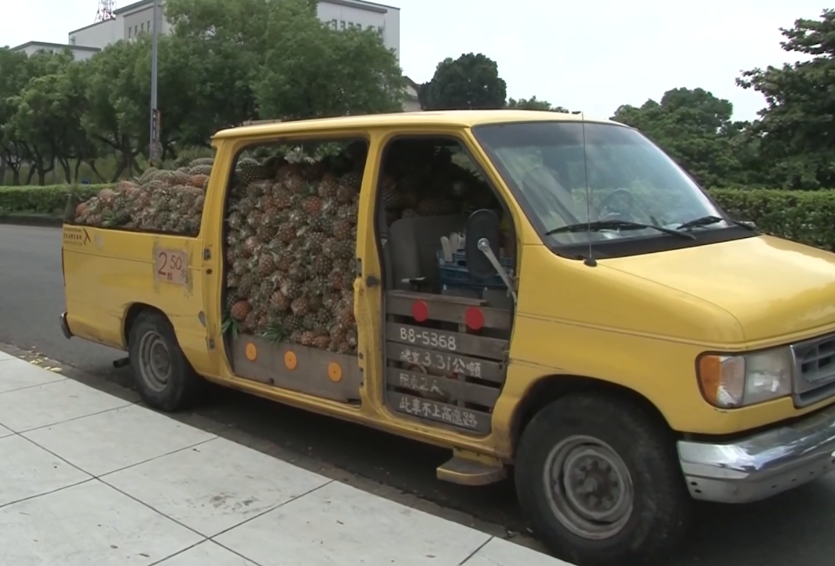 開著沒門鳳梨車,鳳梨攤商說他每日清晨,到名間鄉大庄村產地批發鳳梨,再開車到中彰投等地銷售,產地價薄利多銷,2顆賣50元,不但車子是黃色,自己也穿上黃色T恤,一整車很有整體性,總能吸引顧客目光。