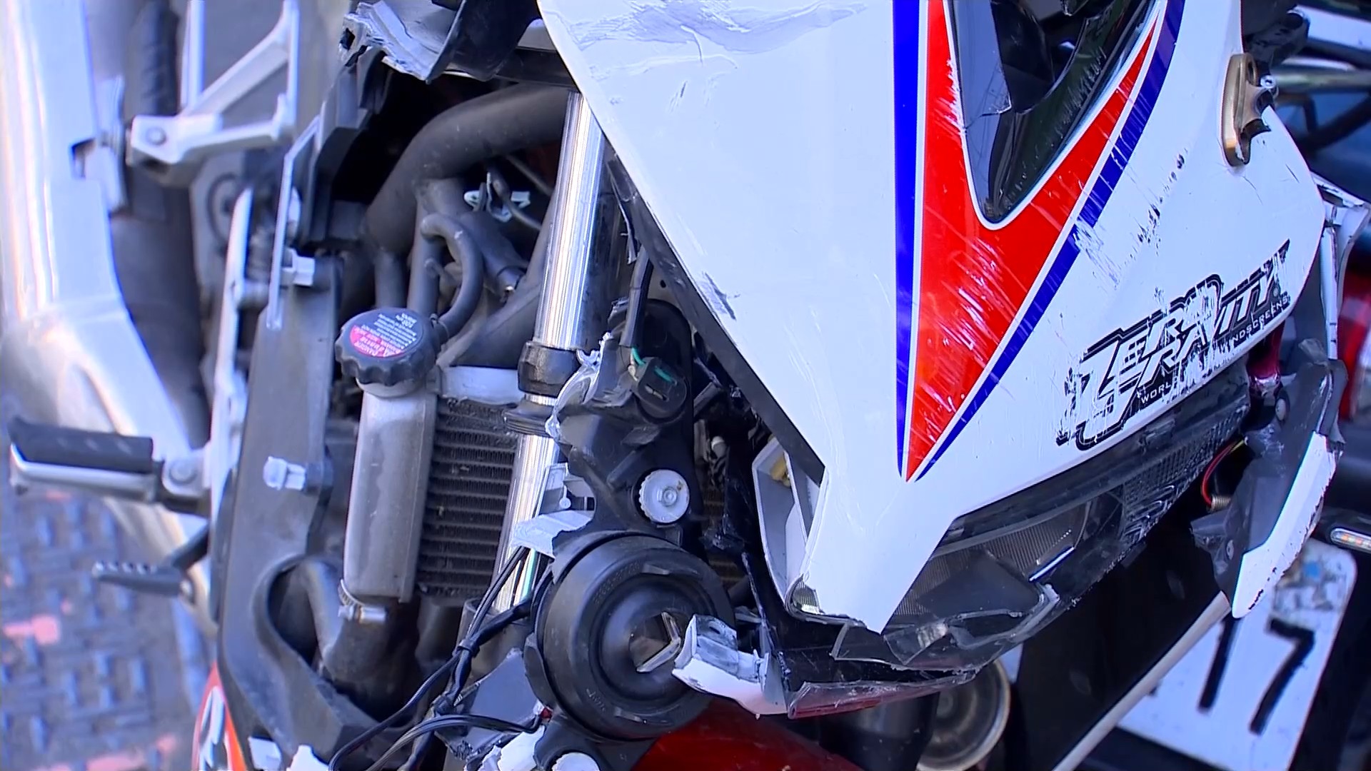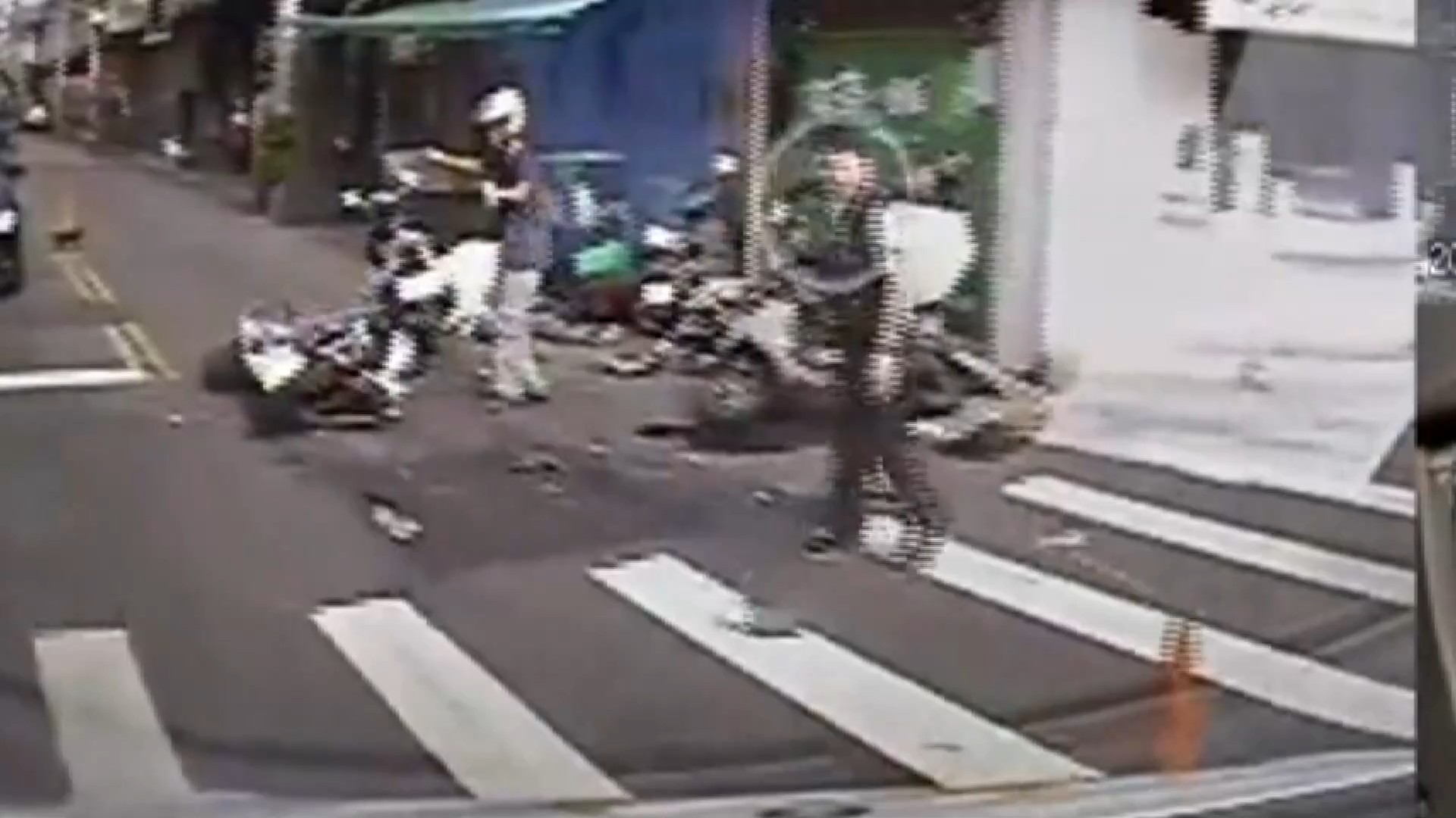 機車對撞快得讓人來不及反應,一輛機車從左邊高速呼嘯而過,當場撞上要左轉機車,強烈撞擊讓機車彈到半空中、零件飛散,另一個鏡頭則拍下路口停等紅燈,貨車經過後,號誌燈準備轉換,機車高速對撞,兩人被撞到翻滾半圈摔飛出去,倒臥地上動彈不得。
