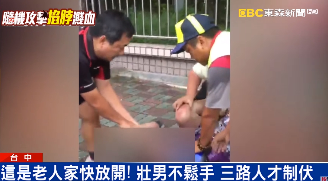 台中一為79歲的老婦人早上6點多到小學附近晨運,卻遭到身形壯碩38歲的陌生男子毆打,還被掐住了脖子,幸好當時有3位民眾路過,緊急制止並報警,行凶的男子沒有前科,甚至也沒有就醫紀錄,莫名其妙見人就打,讓居民和學生家長人心惶惶。
