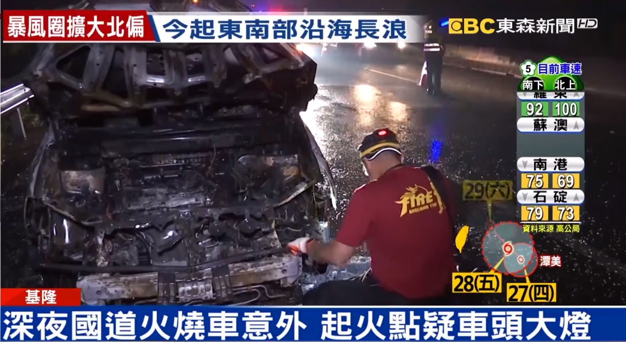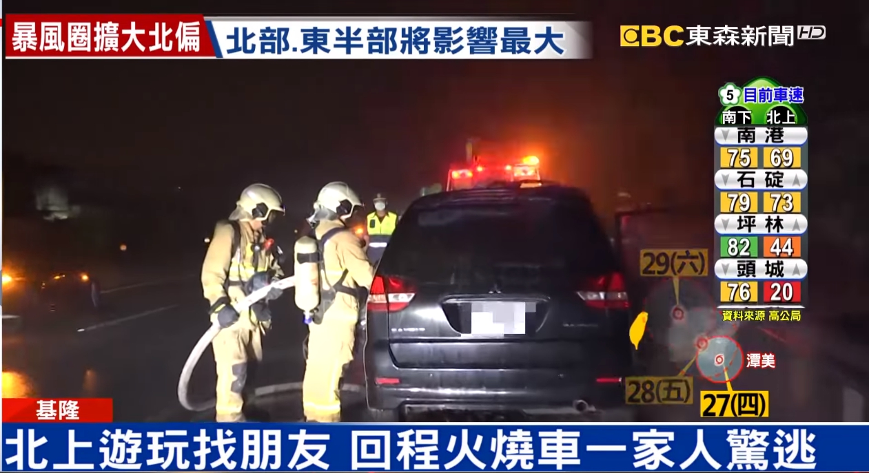 駕駛表示,這輛車是二手車,已經開了將近13年,平時都有保養,這次利用中秋連假帶家人北上找朋友,晚上要回新竹時,在國道一號南下7.9公里,靠近五堵交流道時突然聞到燒焦味,趕緊停車逃生。